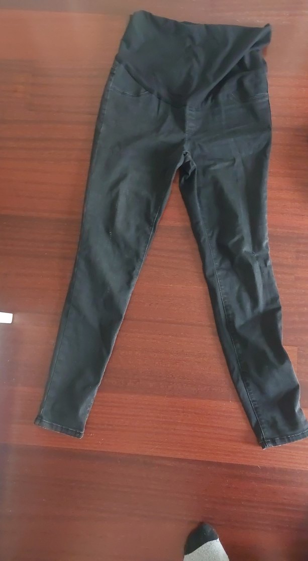 Siyah kot kumaştan, kemerli ve vücuda oturan kesime sahip hamile pantolonu, günlük rahat kullanım için uygundur.