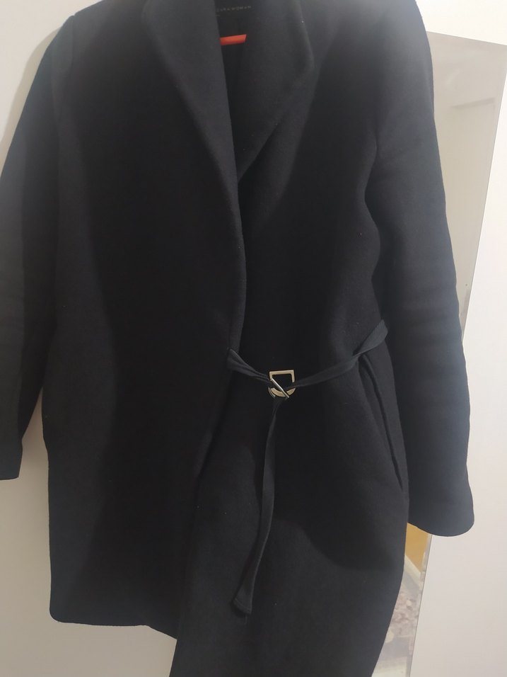 Siyah kaban, metal tokalı kemeri ve geniş yakasıyla klasik bir görünüm sunar. Kalın kumaşıyla sıcak tutar.