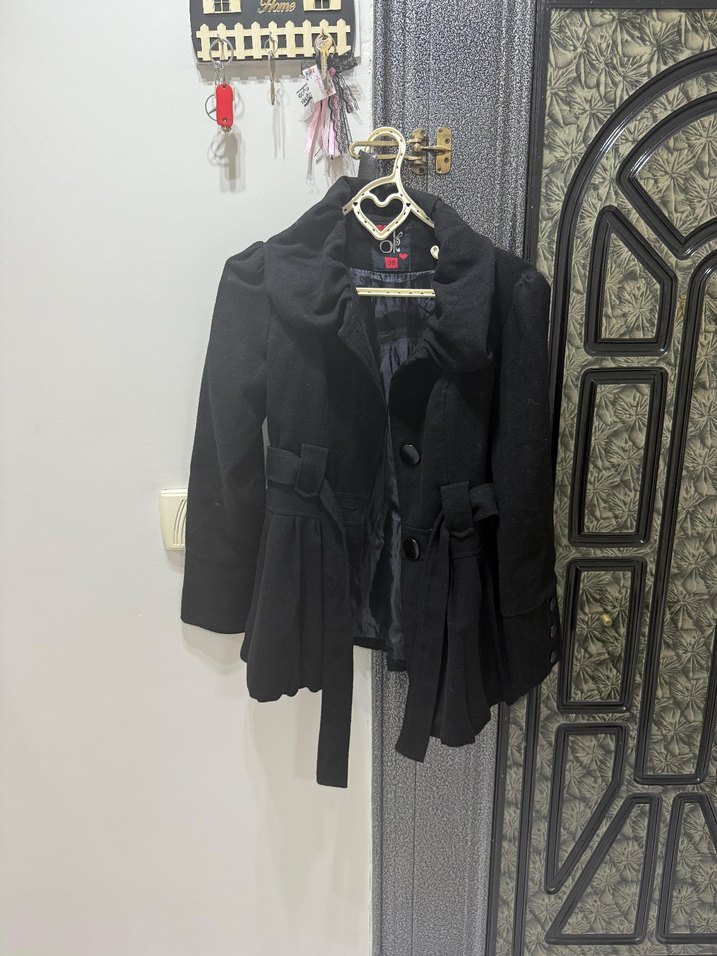 Siyah renk, kemerli ve düğmeli uzun kollu kaban. Yumuşak astarı ve klasik yaka detayı bulunur.