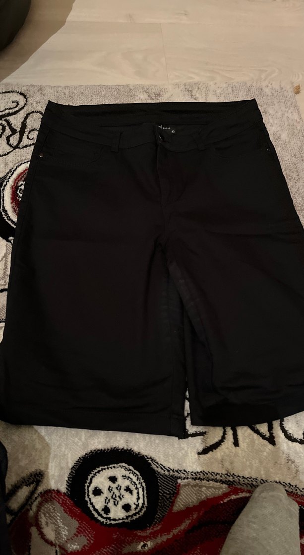 Siyah, kemerli, bol kesim kadın bermuda şort. Sentetik kumaştan üretilmiş, günlük açık hava kullanımı için uygundur.