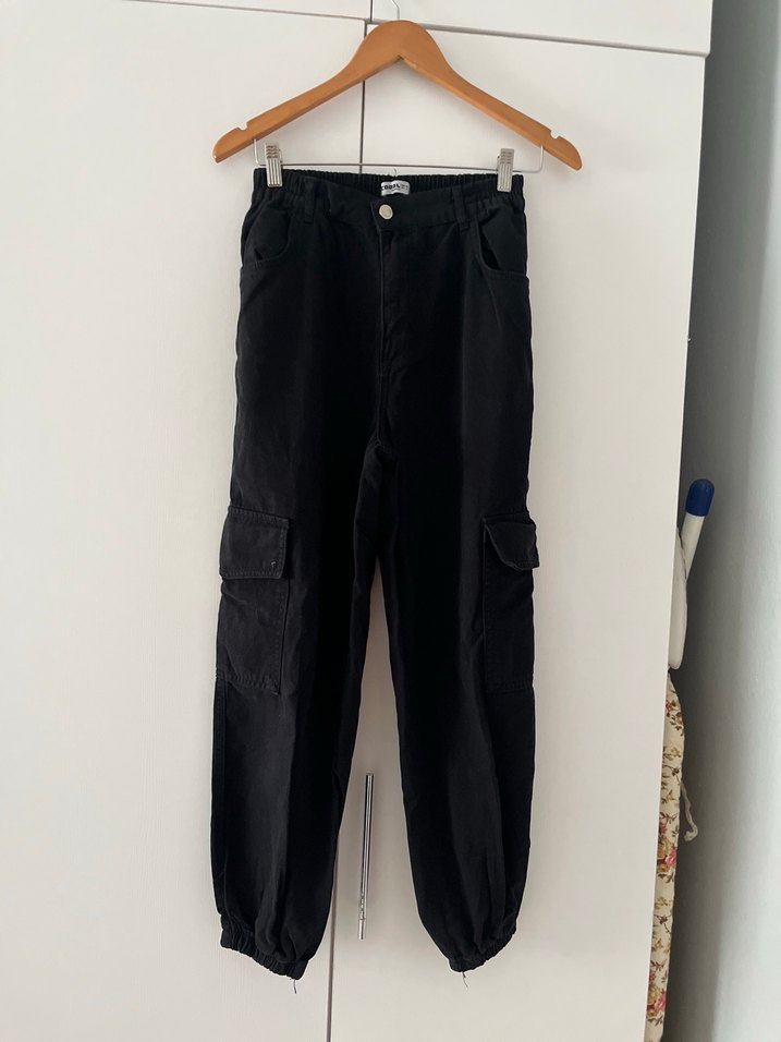 Siyah kot kumaştan, bol kesim ve kemerli, midi boy, cepli kadın pantolonu. Günlük rahat kullanım için uygundur.