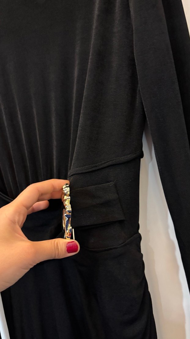 Ofis kullanımı için uygun, şık baskılı tasarıma sahip siyah kemerli kadın broşu. Paris sokak modasına zarif bir dokunuş katıyor. Bel dekoltesi tamamen kapatıldı. Yırtmacı biraz kapatıldı. L beden