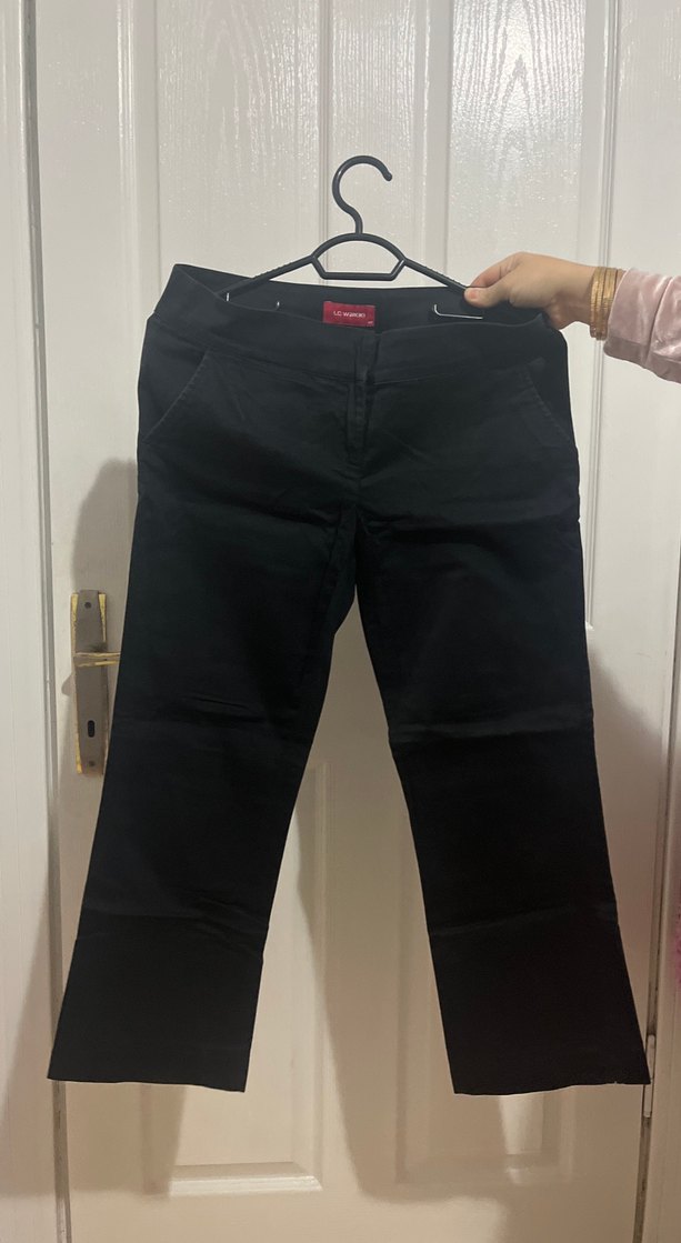 Siyah renkli, kemerli, normal boy, regular fit kadın denim pantolon. Ofis ve günlük sokak stiline uygun, desensiz ve midi boyda.