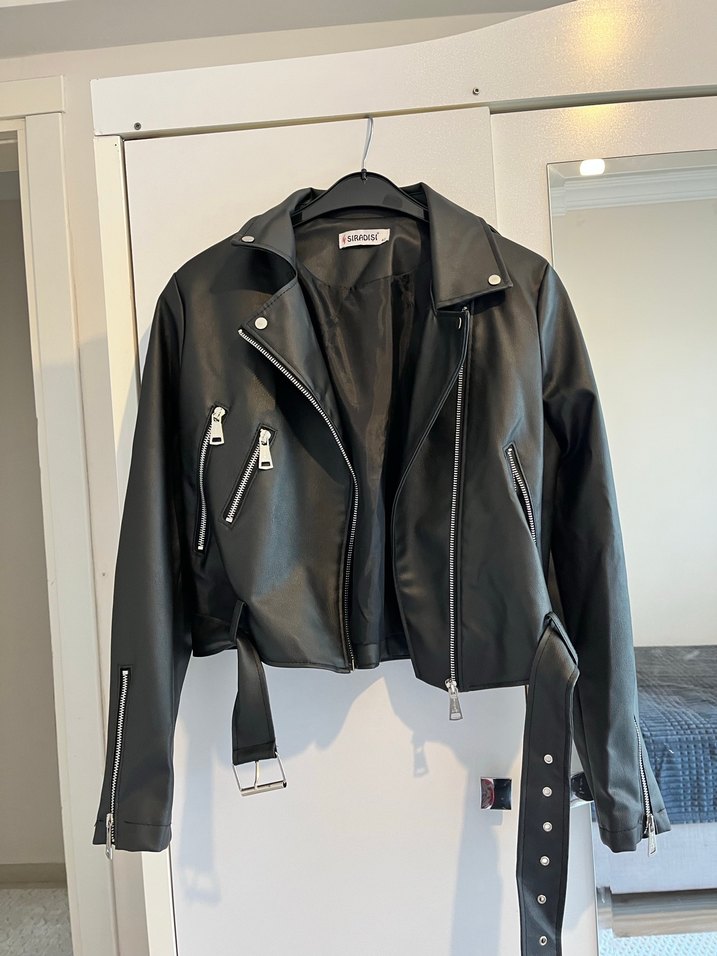 Siyah deri biker ceket, kemerli bel, keskin yakalı, askılı kollu ve dar kesim. Günlük kullanıma uygun, Paris tarzı şıklık sunar hiç giyilmedi.