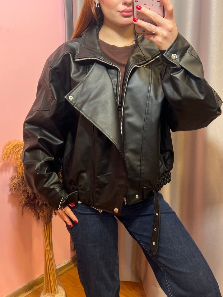 Siyah deri, kemerli, kısa ve bol kesim kadın ceket. Askılı kollu, yakalı ve sokak stiline uygun günlük kullanıma uygun.
