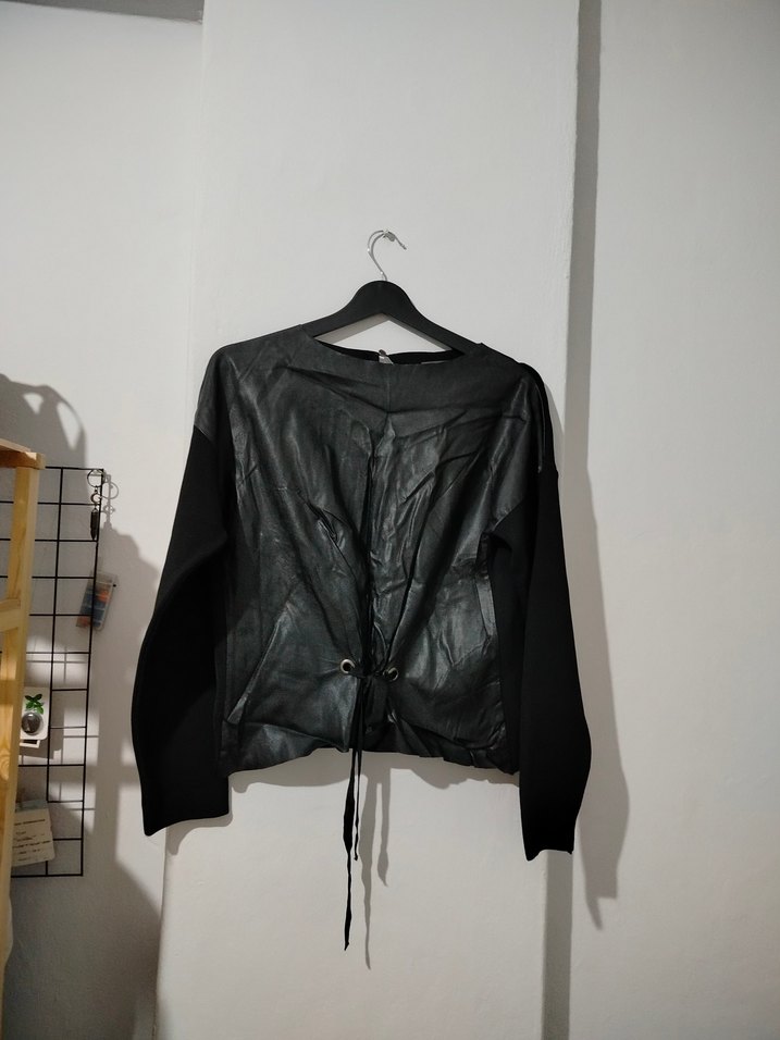 Siyah deri kadın kazak uzun kollu ve yuvarlak yakalıdır. Kemer detaylı, bol kesim ve kısa boydadır. Goth ve grunge punk tarzına uygundur.