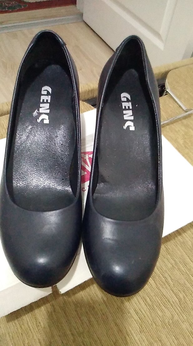 Siyah, kauçuk malzemeden yapılmış, kemerli dolgu topuklu kadın stilettoları. Ofis için uygun, gotik tarzda. Marka: GENC.