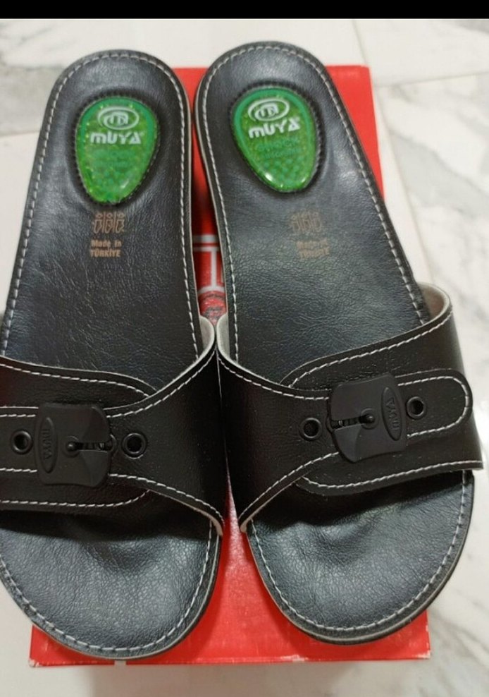 sıyah renkte tokalı kayışlı ve dolgu topuklu kadın terliği. Kauçuk malzemeden üretilmiş, günlük kullanıma uygun minimalist ve şık bir model. Marke 'mUYA' tabanda yer alır.