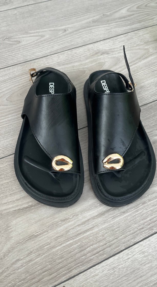 Siyah, kemerli, dolgu topuklu kadın sandalet. Minimalist ve desen içermeyen tasarımıyla günlük rahat sokak stiline uygun. "DESF" işaretlidir.