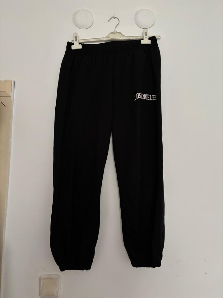 Bu siyah kemerli kadın eşofman altı, bol kesim ve midi boyda, rahat ve trend bir görünüme sahiptir. Üzerinde 'OSANGELES' yazısı bulunur.