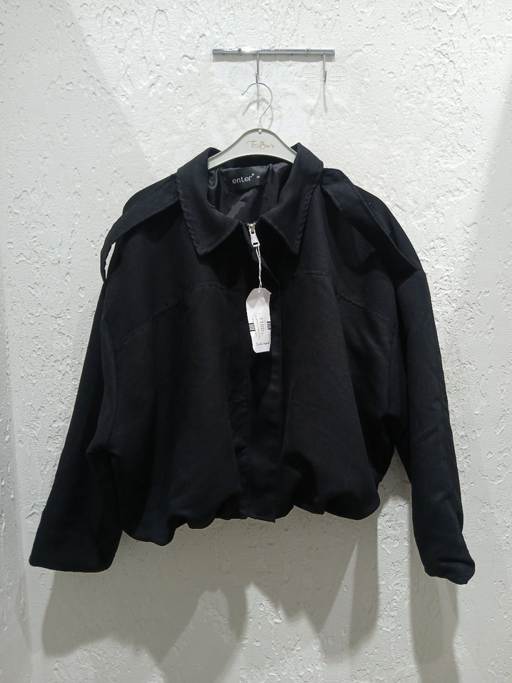 Siyah keten kumaştan, yakalı ve uzun kollu, kemerli bol kesim midi uzunlukta kadın ceket. Desensiz, sokak modasına uygun bir parça.