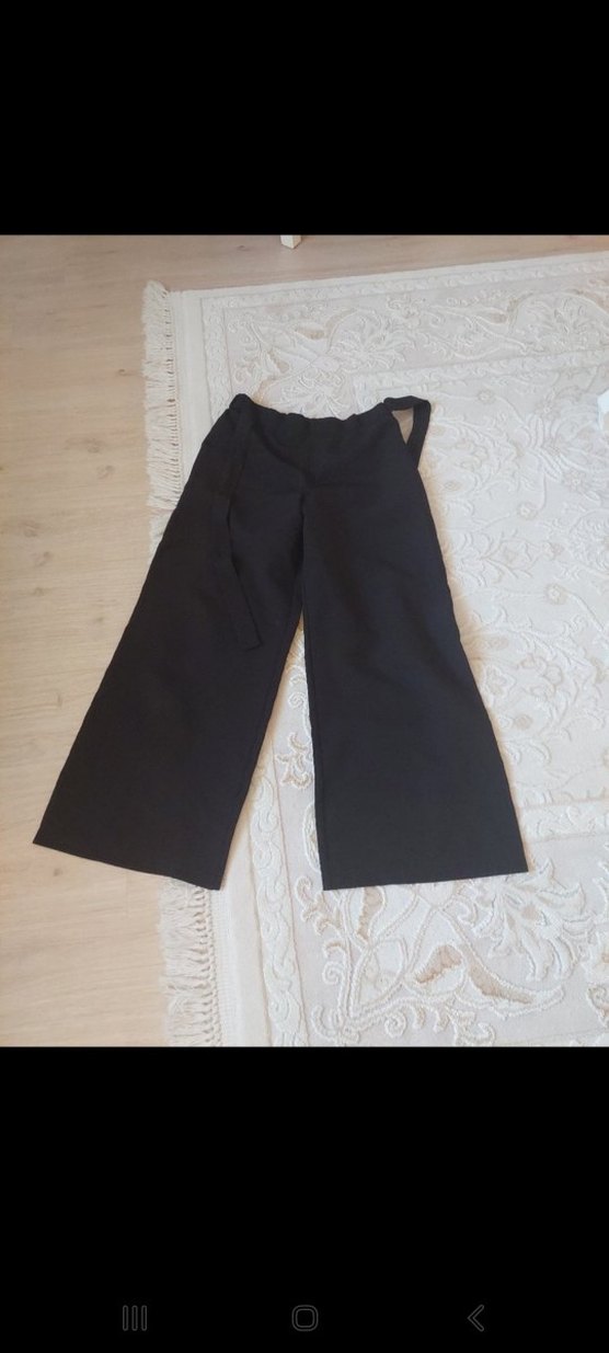 Siyah keten kumaştan, kemerli ve midi boyda, bol kesim kadın pantolon. Rahat ve şık, günlük kullanıma uygun.
