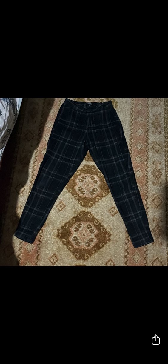 Siyah kemerli, regular fit kadın keten kot pantolon. Orta boy, koyu kareli desenli, rahat sentetik kumaştan günlük kullanıma uygun.