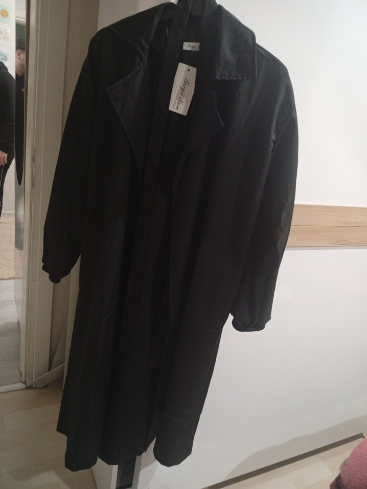 Uzun siyah keten trençkot, kemerli ve kesik yaka detaylıdır. Düzenli kesim, uzun kolludur ve ofis ile günlük şıklık için uygundur.