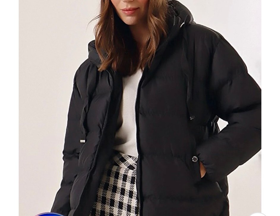 Kemer detaylı, yüksek yakalı siyah, fitted kış montu. Normal midi boyda, strappy kollu, günlük kullanıma uygun rahat sokak stili mont. ❄️