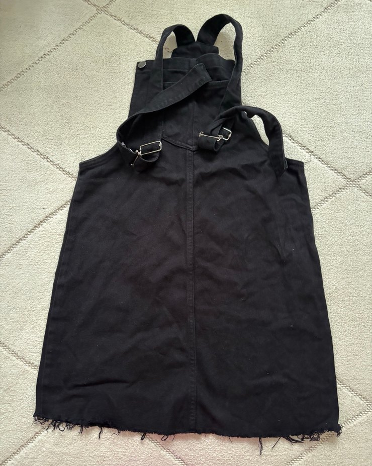 Kemerli, askısız siyah kısa salopet. Sentetik kumaştan, bol kesim, salaş ve yıpranmış etek ucu detaylı. Günlük ve sokak tarzına uygun.