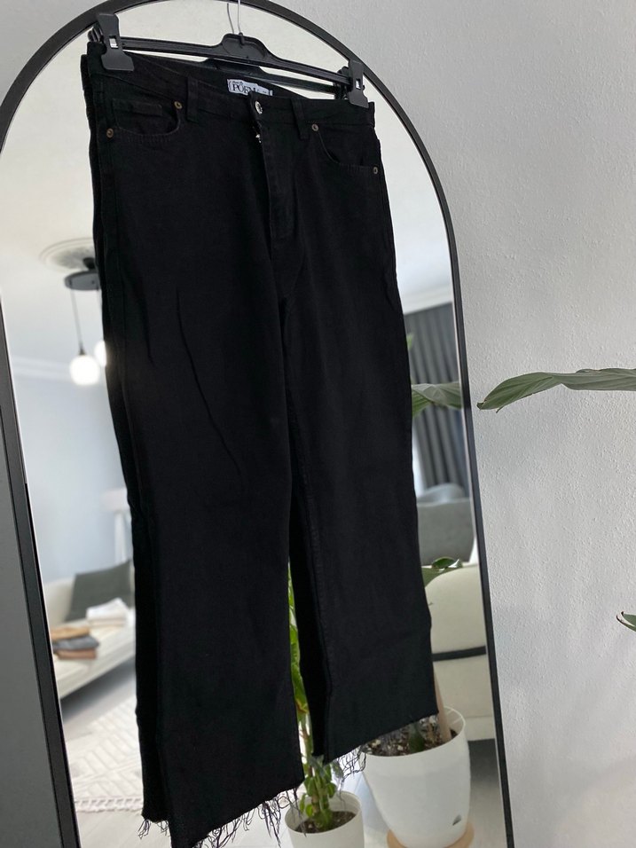 Siyah denim kumaştan, kemerli ve bol kesimli uzun kadın kot pantolon. Sokak stiline uygun, günlük kullanıma elverişli.
