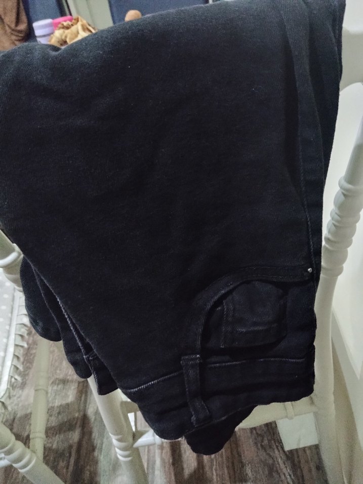 Siyah kot kumaştan, kemerli ve midi boy, bol kesim kadın pantolonu. Rahat sokak stili ve günlük kullanım için uygundur.