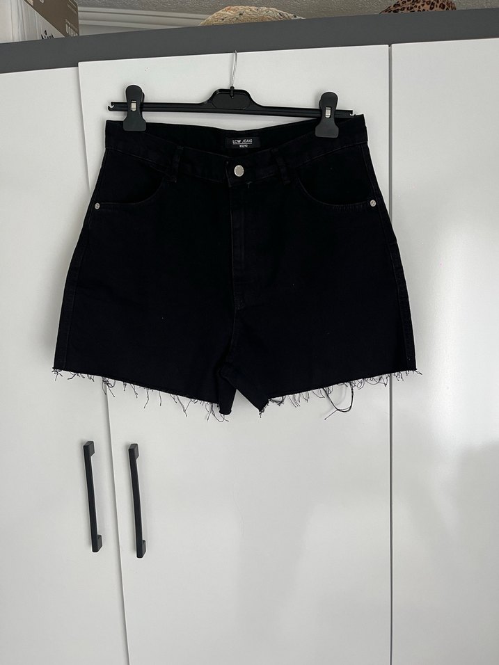 Siyah kot şort, kemerli ve bol kesimli. Mini boyda, salaş ve günlük sokak stiline uygun.