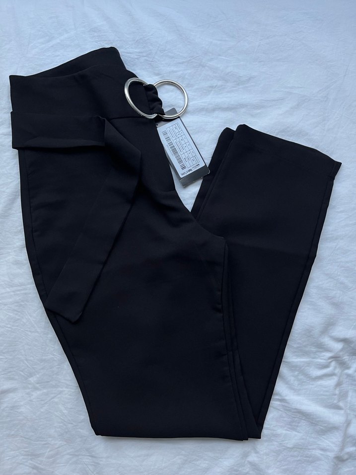 Bağlama detaylı kalem kumaş pantolon. 0 üründür etiketli. Siyah, kemerli, ipeksi dokulu kumaş pantolon. Regular fit. Ofis ve sokak stiline uygun, desen içermeyen şık tasarım.