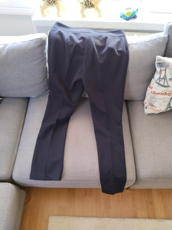 siyah renkte, kemerli ve normal boy uzunluğunda kadın kumaş pantolon. Düz ve iş ortamına uygun, rahat kalıplı bir tasarıma sahiptir. ️