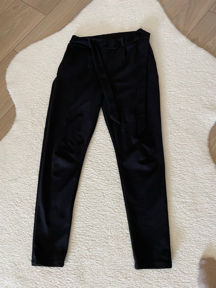 Kadınlar için siyah kumaş pantolon, normal kesim ve midi boyda, kemerli bel detayına sahip. Pürüzsüz sentetik kumaştan, günlük kullanıma uygun şık ve iş stilinde.