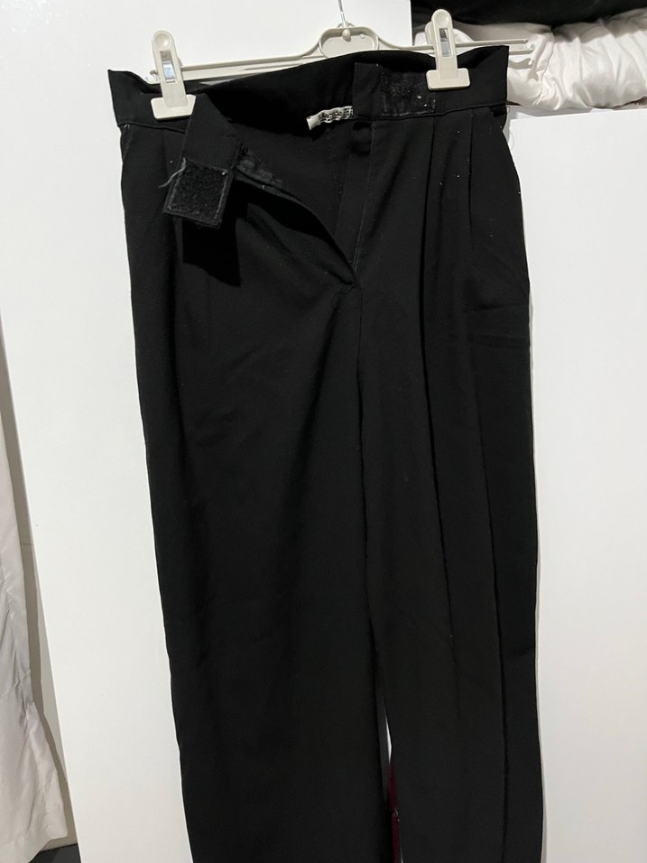 Siyah, kemerli, normal boy midi kesim kadın kumaş pantolon. Ofis için uygun, minimalist tarzda, ipeksi dokulu kumaştan.