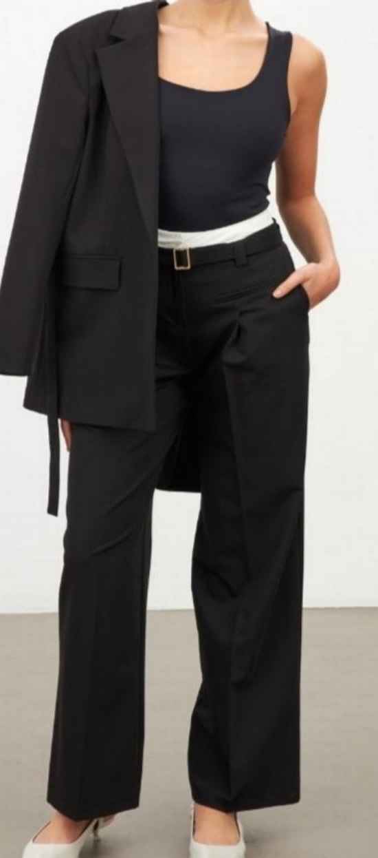 Siyah, kemerli ve regular fit kadın kumaş pantolon. pamuksu dokulu, normal boy ve desensiz, bwlinde beyaz kumas yukseltme mevcut.ofis veya gündelik şıklık için uygun.