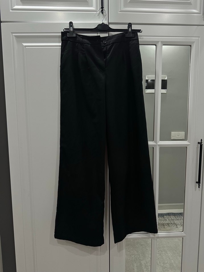 Siyah, ipeksi kumaştan, normal boy ve kemerli, iş ortamına uygun rahat kesim kadın pantolonu.