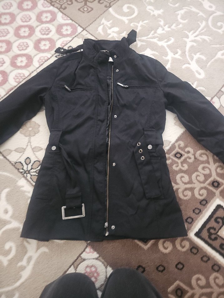 Siyah renkte, kemerli ve midi uzunlukta, sentetik kumaştan yapılmış, yakası kesik ve askılı kollu dar kesim kadın ceket.
