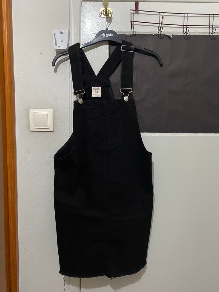 Kemerli, halter yaka askılı, siyah denim midi salopet. Raw kenar detayı ve fitted kesimiyle gotik tarzda. Günlük kullanıma uygun.