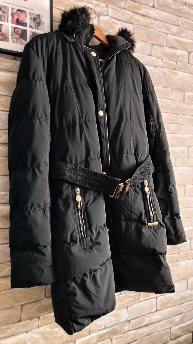 Siyah renkte, kemerli ve oturan kesime sahip kadın kışlık mont. Sentetik kumaştan, midi boyda, notched lapel yakalı ve strappy kollu, rahat sokak stili için uygun.