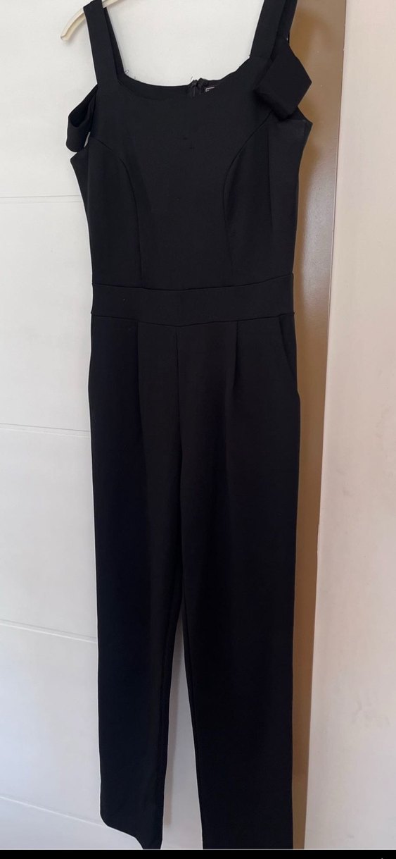Siyah, kemerli, kolsuz tulum. Notlu yaka ve midi boyuyla ofis için uygun, düz ve rahat kesim.