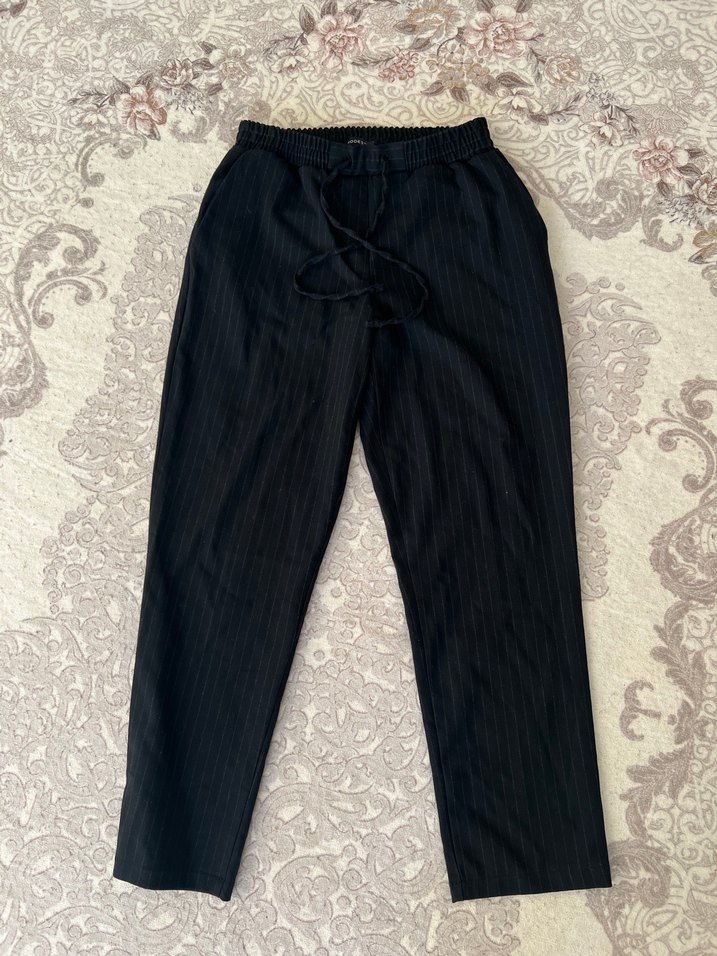 Siyah, kemerli, midi boy kadın pantolon. Rahat kalıp ve yumuşak sentetik kumaştan, günlük kullanıma uygun.