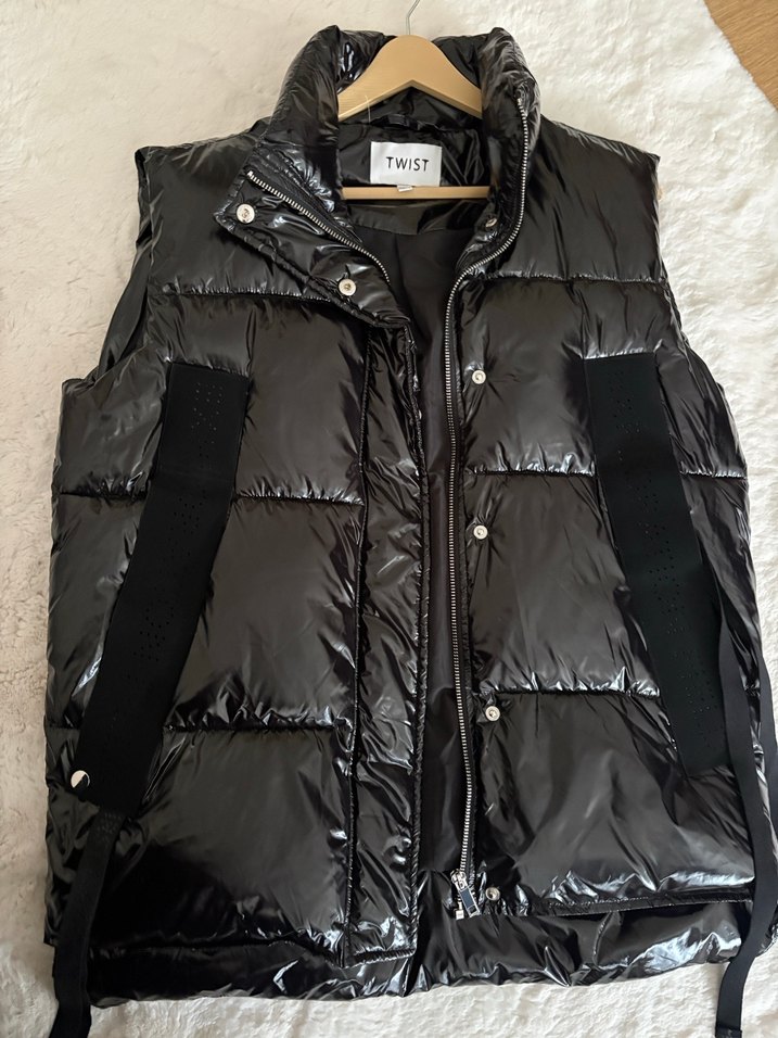 Siyah, kemerli ve yakalı, parlak sentetik kumaştan yapılmış, midi boy, vücuda oturan kolsuz kadın şişme yelek. Günlük sokak stili için uygundur.