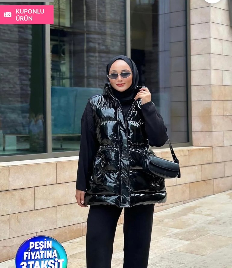 Siyah, kemerli, yüksek yakalı, kolsuz şişme yelek. Parlak sentetik kumaştan, midi boyda, etnik desenli, bol kesim, sokak tarzına uygun.