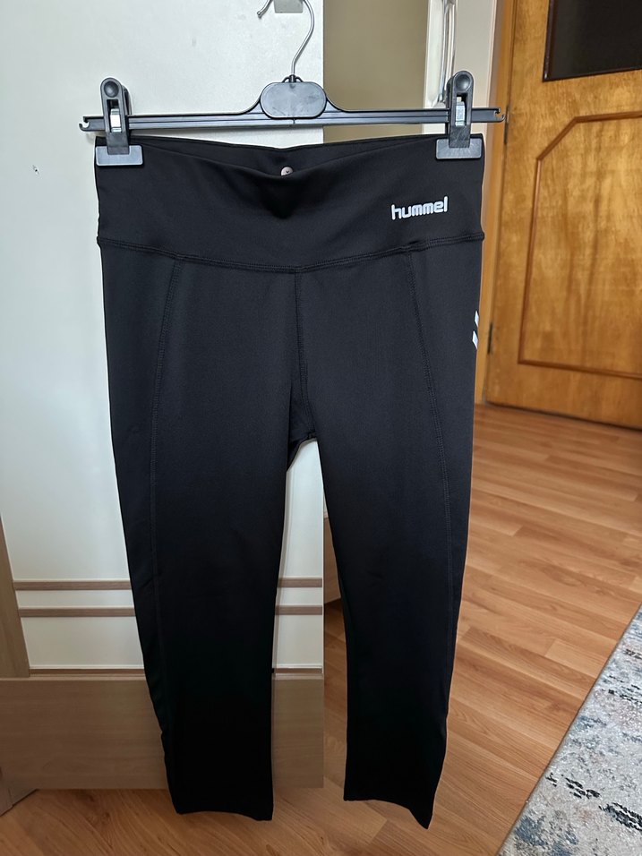 Siyah, kemerli, düz desenli ve sentetik kumaştan yapılmış, sportif ve günlük kullanıma uygun kadın taytı.