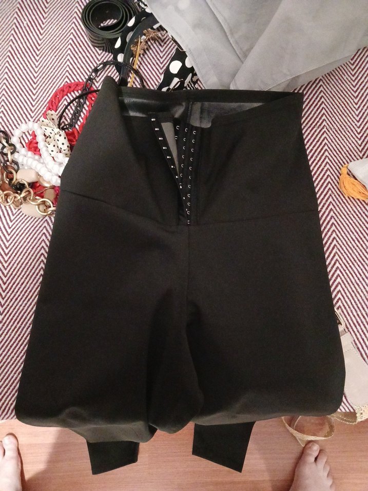 Siyah kemerli, vücuda oturan midi pantolon. Pürüzsüz sentetik kumaştan, günlük athleisure için cesur goth tarzı.
