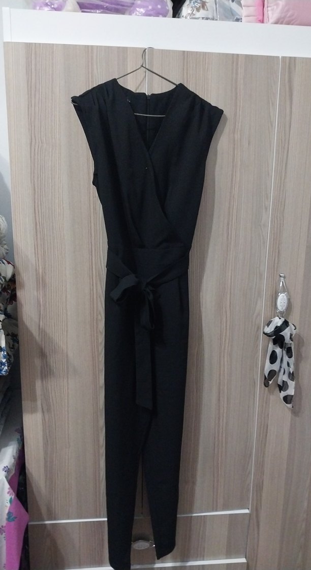 Siyah, kolsuz, V yaka ve kemerli kadın tulumu. Rahat kesimli ve sentetik kumaştan üretilmiştir. Ofis ve günlük kullanım için uygundur.
