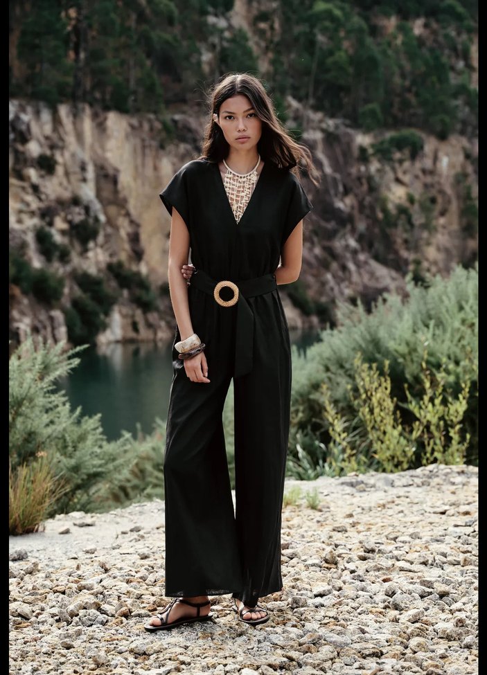 Siyah renkli, kemerli ve V yakalı, bol kesim uzun tulum. Kısa kollu ve ipeksi kumaştan, bohem tarzında dış mekan kullanımı için uygun.