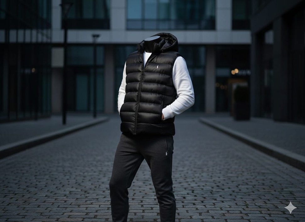 Yumuşak kumaştan yapılmış siyah, kemerli, kapüşonlu ve kolsuz erkek yelek. Normal kesim ve midi boyda, dış mekan kullanımı için uygun. Tekli ve toplu alım yapılmaktadır