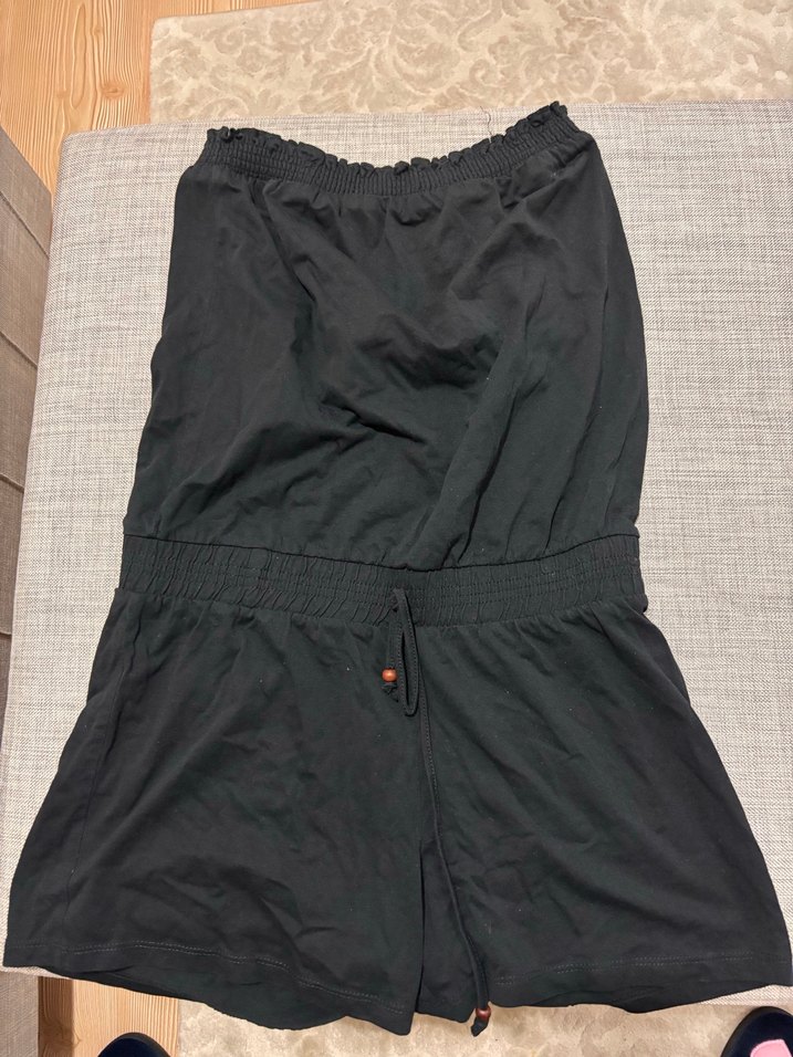 Siyah keten kumaştan, kemerli, straplez ve kolsuz tasarıma sahip mini uzunlukta bol kesim tulum.
