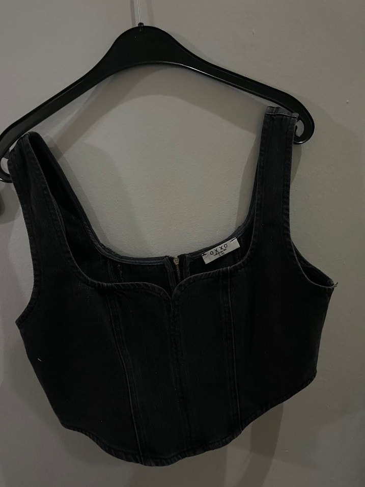 Fitted kesim siyah denim büstiyer, askısız ve kolsuz tasarıma sahip. Kemer detayları cesur bir hava katıyor, kısa boyu sokak modasına uygun.