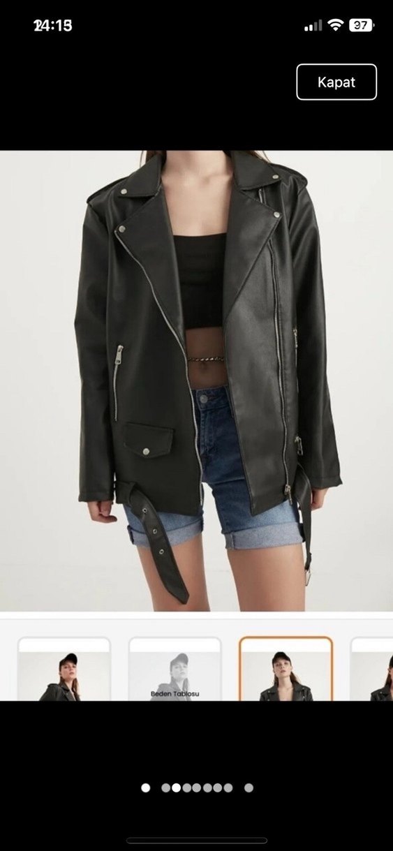 Kemer detaylı, kısa kesim, siyah deri biker ceket. Notch yaka ve askılı kollarıyla sade ve şık