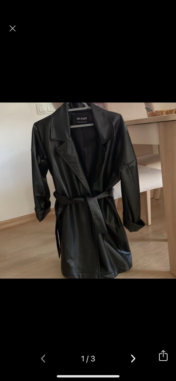 Siyah deri ceket, kesimli yaka ve kemerli bel detayına sahip. Askılı kollu, regular fit ve kısa boyda, ofis için uygun.s-m beden
