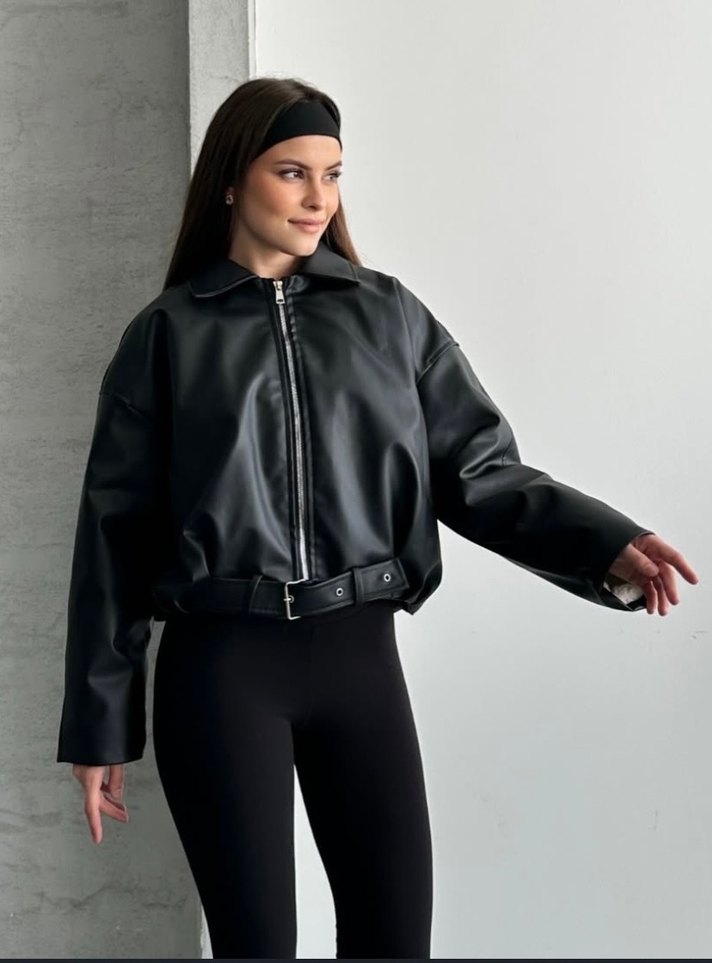 Siyah deri kadife ceket, bol kesim, uzun kollu ve yakalıdır. Kemer detaylı ve kısa boylu, günlük kullanıma uygundur. Sıfır etiketli ürün. Ön yerinde iğne izi vardır.Geri iade yoktur.