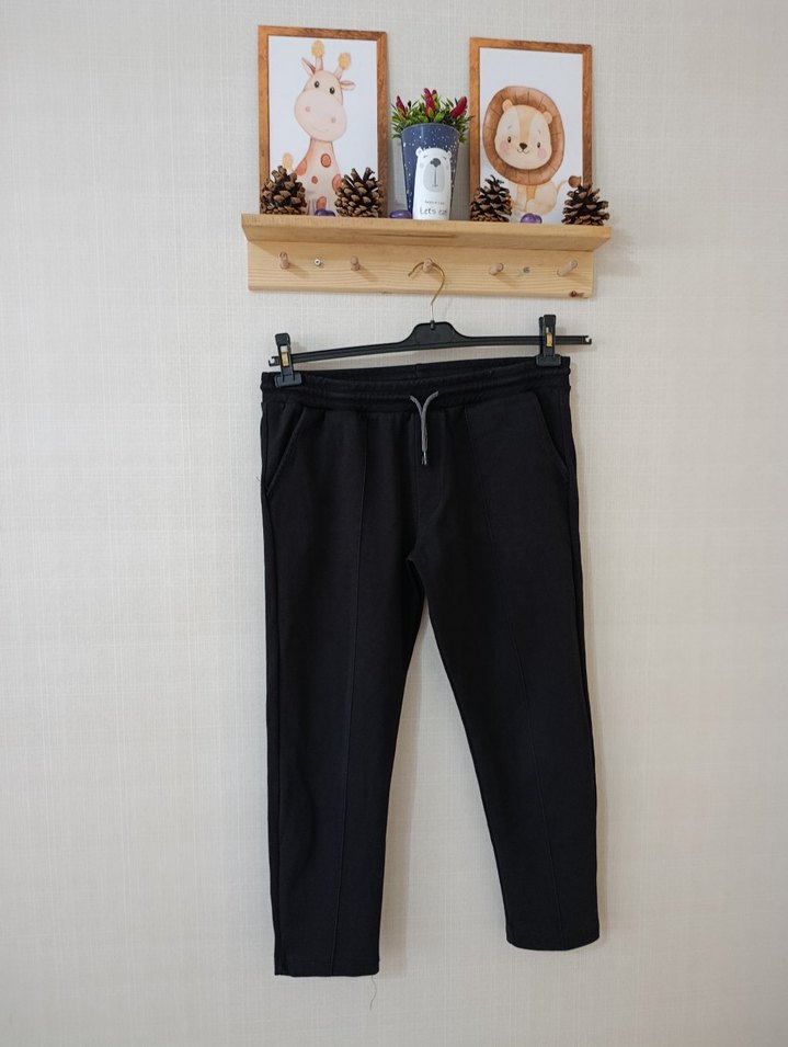 Yumuşak ve sıcak kumaştan siyah, kemerli, kısa kesim erkek pantolonu. Günlük dış mekan sokak stili için uygundur. BOY 95 PAÇA EN 16 , EŞOFMAN TARZINDA