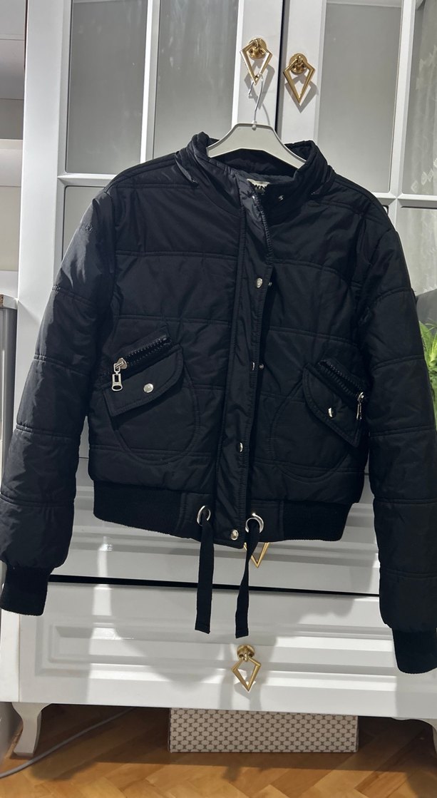 Kemer detaylı, yüksek yakalı ve askılı kollu siyah, kısa kesim, vücuda oturan kadın ceketi. Yumuşak ve sıcak kumaştan, fermuarlı ceplidir.