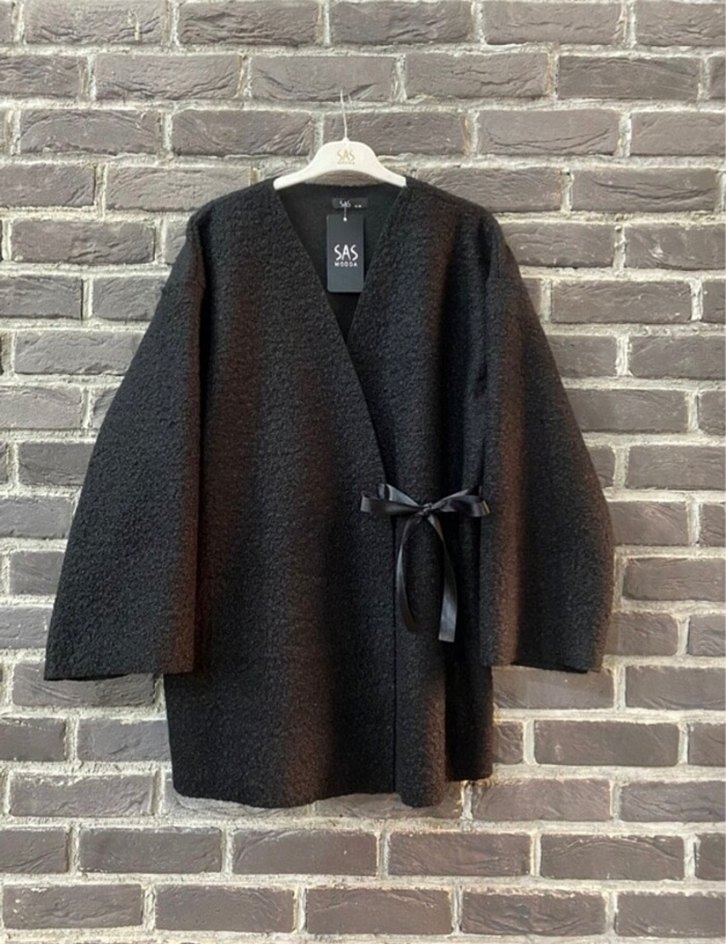 Siyah kısa uzun kollu kadın yün kaban, bol kesim ve kemerli detaylara sahip. Yumuşak yün kumaştan üretilmiş, notch yaka ve günlük kullanıma uygun.