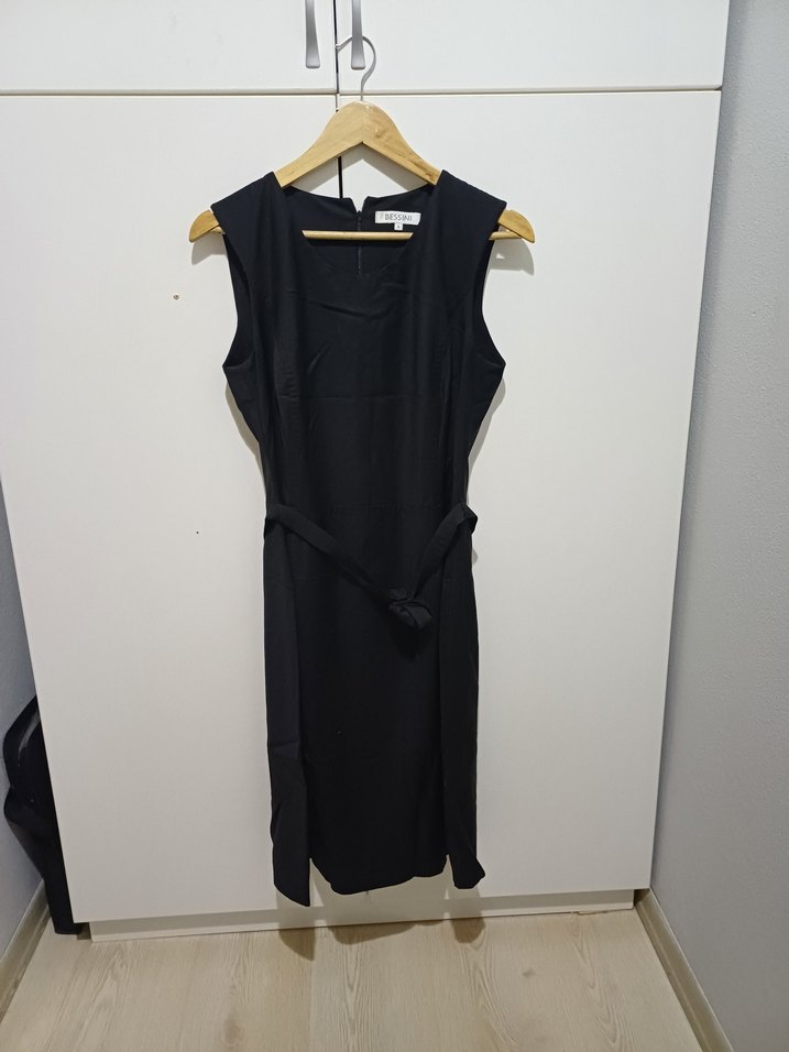 Siyah, kolsuz, kemerli, uzun boy klasik kesim kadın elbisesi. Ofis kullanımı için uygun minimal ve şık tasarım.